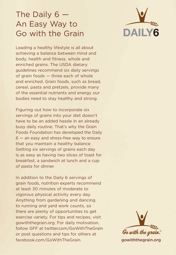- The Daily 6 – An Easy Way to Go with the Grain with the following messaging: the USDA recommends at least six one-ounce servings of grains daily to maintain a healthy diet.