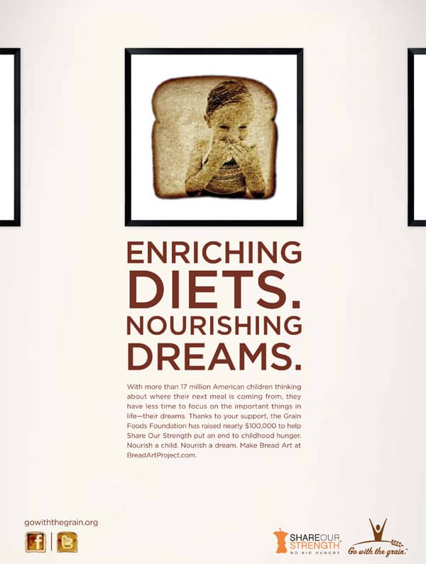 GFF created BreadArtProject.com where consumers could create a personalized piece of bread art at no cost by uploading a favorite drawing or photo, or designing a new one online using a digital slice of bread as a canvas. For each piece of bread art created, GFF donated $1 to Feeding America. One dollar provides seven meals or four bags of groceries to the 25 million people served by food banks annually.